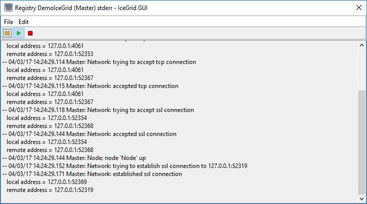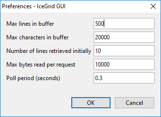 When in the running state, the dialog attempts to retrieve new lines from the log file (through IceGrid) every Poll period seconds.