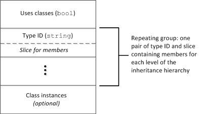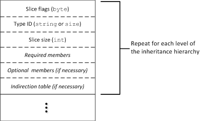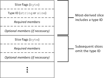 The leading byte of each slice is a set of bit flags that specifies the features of the slice. The compact format includes a type ID in the initial (most-derived) slice but omits the type ID from all subsequent slices.