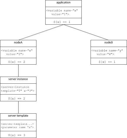 In this diagram, the variable x is defined at the application level with the value 1. In node A, x is overridden with the value 2, whereas x remains unchanged in node B. Within the context of node A, x continues to have the value 2 in a server instance definition. However, when x is used as the name of a template parameter, the node's definition of x is overridden and x has the value 3 in the template's scope.